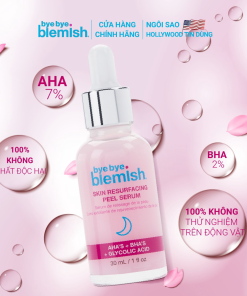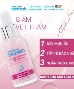 Peel da chết hóa học là phương pháp loại bỏ các tế bào chết bằng acid AHA + BHA ở nồng độ cao. Có tác dụng thanh lọc, tái tạo làn da hiệu quả hơn so với tẩy tế bào chết vật lý. Bye Bye Blemish Skin Resurfacing Peel Serum với công thức AHA (Axit Glycolic, Axit Lactic) + BHA (Axit Salicylic) + Thành phần tự nhiên (quả Dây Bát, hạt và hoa Sầu Đâu) giúp giảm vết thâm, nếp nhăn, lỗ chân lông to, đều màu, cải thiện làn da rạng rỡ, bảo vệ da trước tác hại từ tia UVA, UVB.
