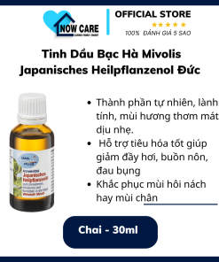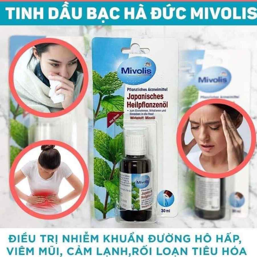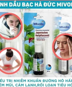 - Tinh Dầu Bạc Hà Mivolis Pflanzliches Arzneimittel Japanisches Heilpflanzenol sản xuất tại Đức có thành phần chiết xuất từ tinh dầu bạc hà và một số nguyên liệu tự nhiên khác. Sản phẩm không chứa chất bảo quản, mùi hương dễ chịu, chỉ 2-3 giọt mỗi lần sử dụng giúp cơ thể được giữ ấm trong thời tiết lạnh, giảm đáng kể tình trạng dị ứng mũi,…