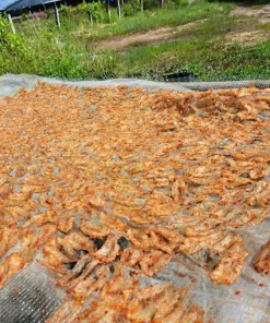 Tôm tươi bóc vỏ chẻ ra ướp tiêu và đường đem phơi nắng không chất bảo quản