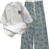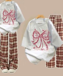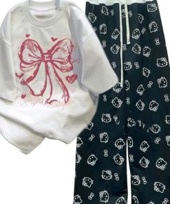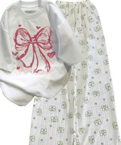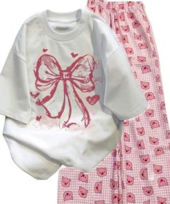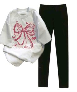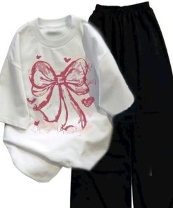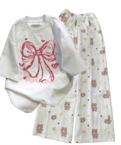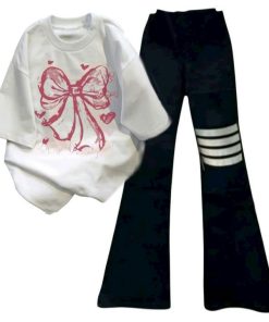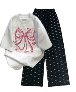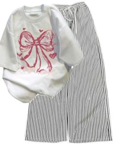 – Tên Sản phẩm: Tổng hợp các sét Bộ Đồ Quần Ống Rộng + mix áo phông Hình Nơ Hồng Loang màu trắng