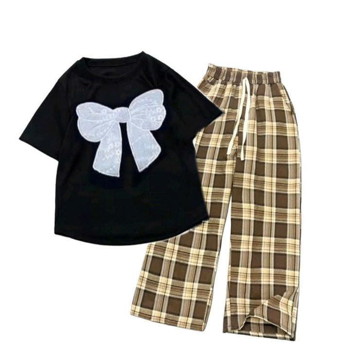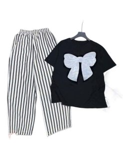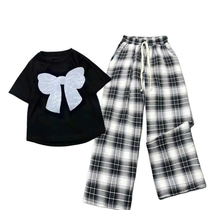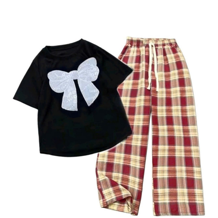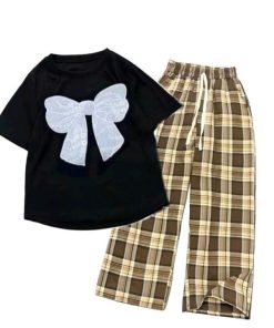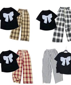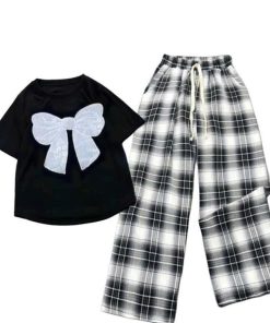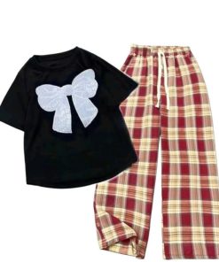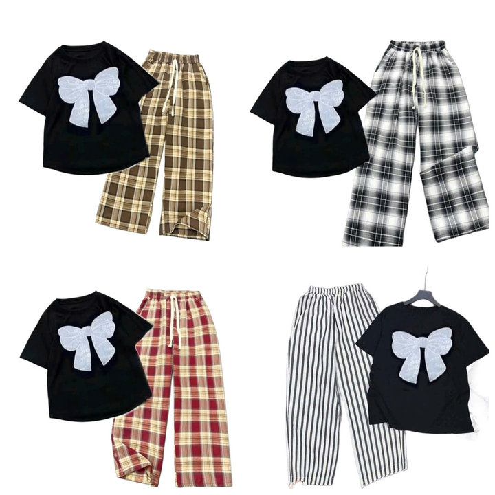 – Tên Sản phẩm: Tổng hợp các Sét bộ đồ quần ống suông kẻ Caro chất thô mềm + mix áo croptop tăm lạnh – in Hình Nơ Trắng xinh xắn