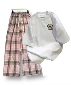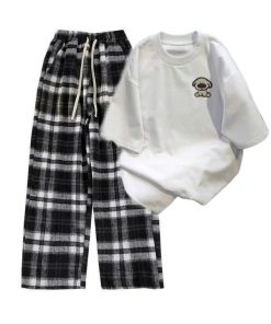 – Tên Sản phẩm: Tổng hợp các sét bộ quần kẻ caro + mix áo phông in hình cún nâu ở ngực