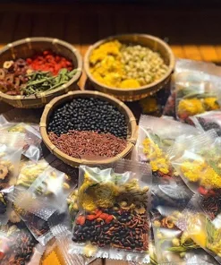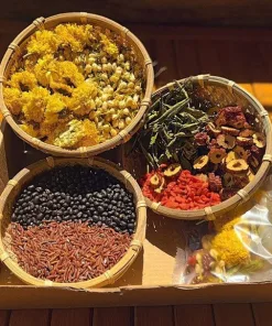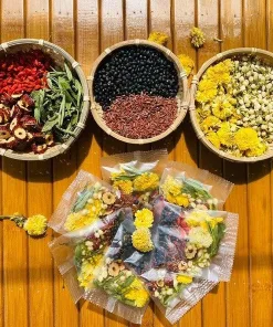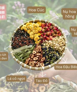 Thành phần: Gạo lứt huyết rồng, Đậu đen xanh lòng, Táo Đỏ, Cỏ Ngọt, Hoa Nhài, Hoa Cúc, Nụ Hoa Hồng, Hoa đậu biếc