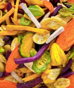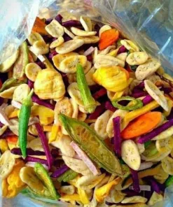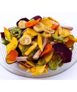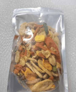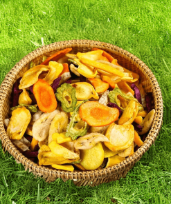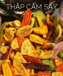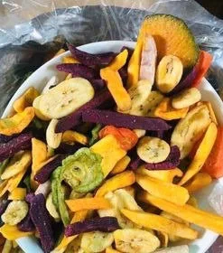 Thành phần: Trái cây, hoa quả sấy: Chuối, mít, khoai lang, khoai ngọt, đậu bắp,…khoai lang tím, khoai lang vàng,…