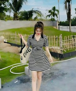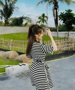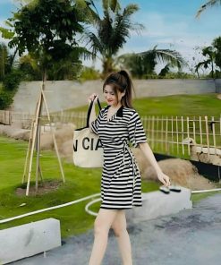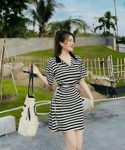 Váy đầm sọc nữ cổ sơ mi rút dây eo tay ngắn thun cottton sọc trắng đen kiểu hàn quốc thời trang sang chảnh