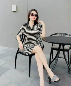 Váy đầm sọc nữ cổ sơ mi rút dây eo tay ngắn thun cottton sọc trắng đen kiểu hàn quốc thời trang sang chảnh