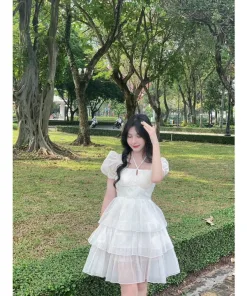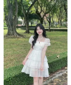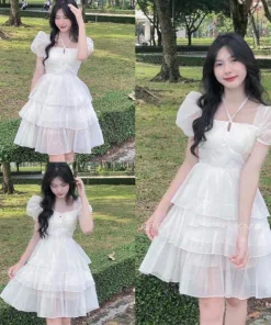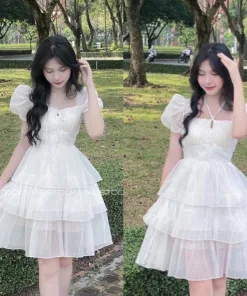 – Tên Sản phẩm: Váy Von 3 tầng dáng xoè buộc cổ tay bồng nữ trắng