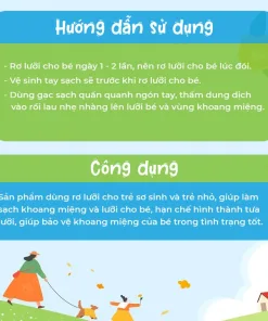 – Dùng gạc sạch quấn quanh ngón tay, thấm dung dịch vào rồi lau nhẹ nhàng lên lưỡi bé và vùng khoang miệng.